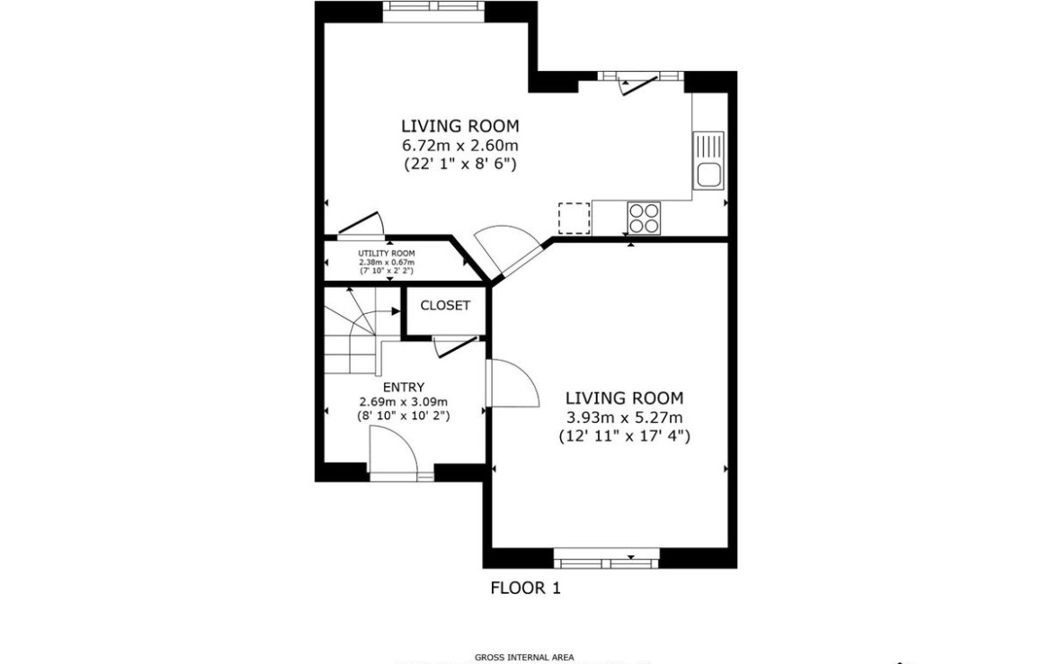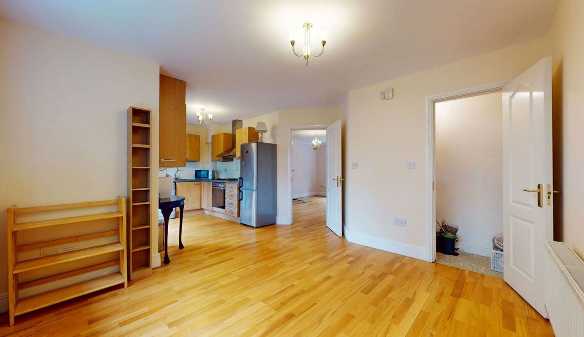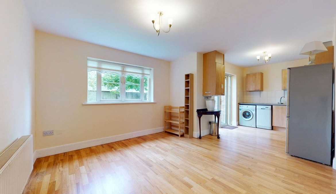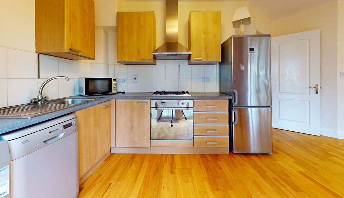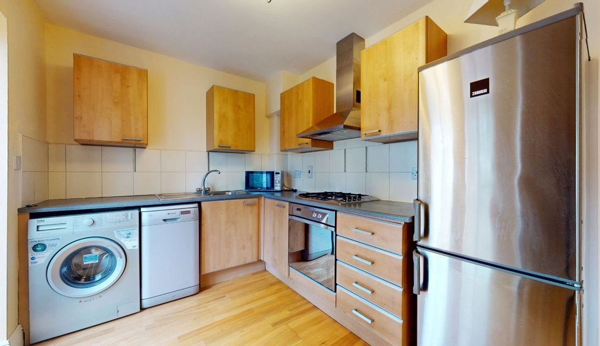 Kitchen Area: 3.4m x 2.35m Eye and floor level kitchen units with tall fridge freezer, washing machine, dishwasher, oven, hob and extractor fan. Semi-solid timber flooring. Tiled splashback. Patio doors to communal garden.