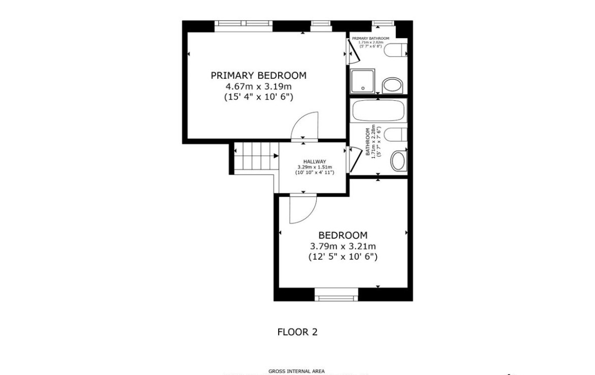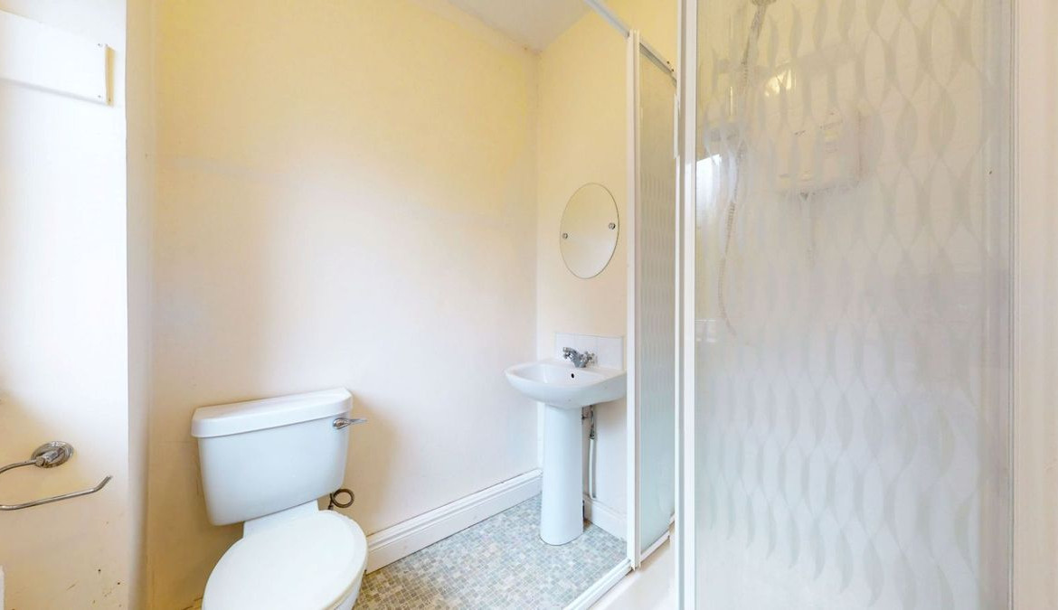 En-suite: 1.85m x 1.7m with two piece white suite and shower unit with electric shower. Tiled splashback. Window for natural light and ventilation.