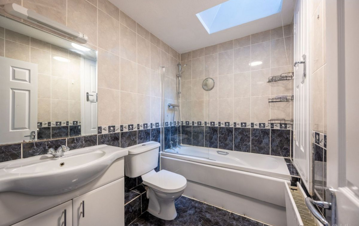 Bathroom: 2.41m x 1.72m Fully tiled bathroom with three piece white suite. Storage under sink. Velux window. Hot press with immersion.
