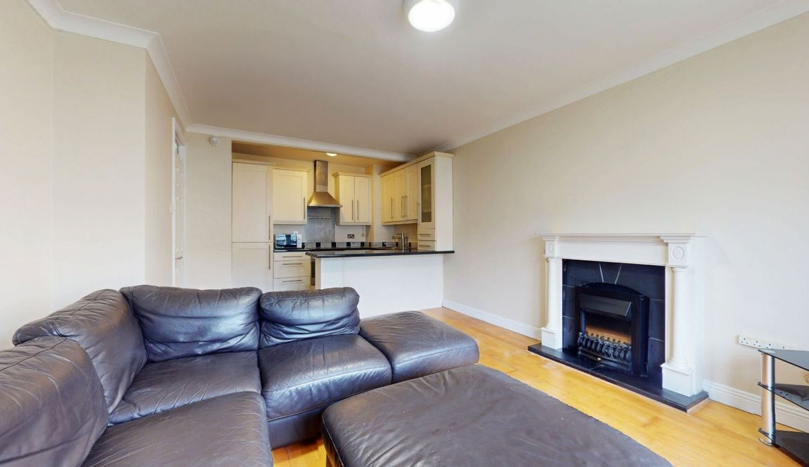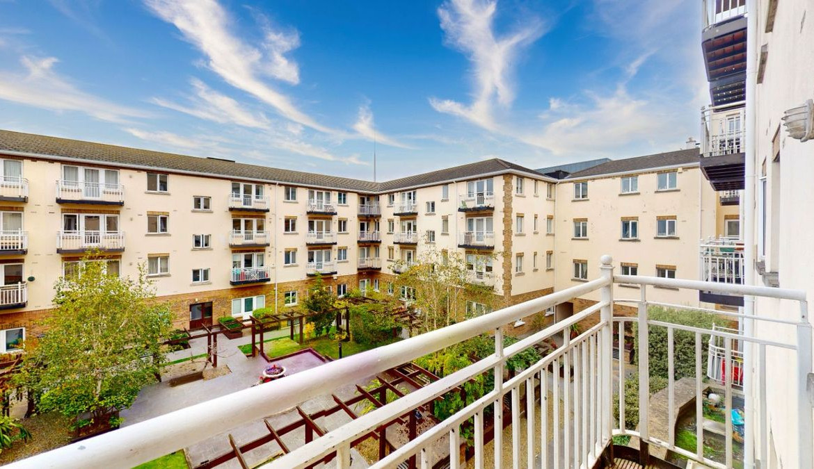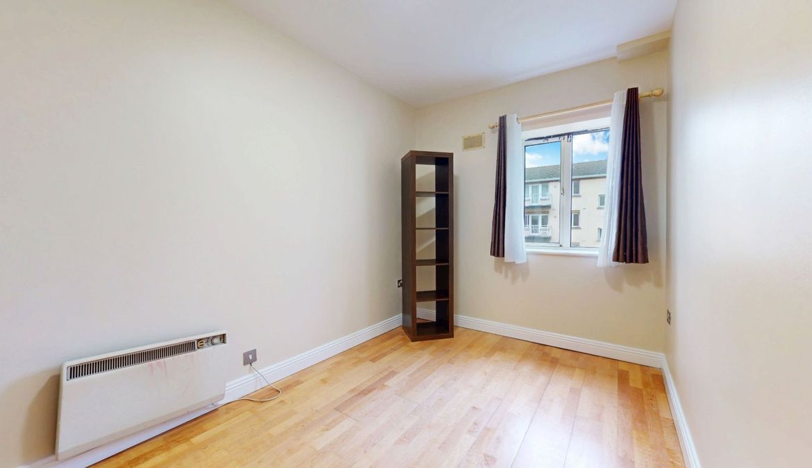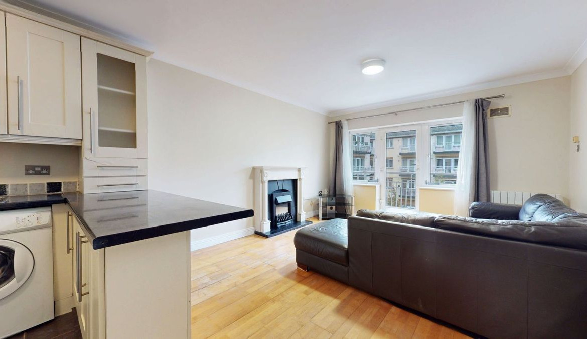 Entrance Hallway: With timber flooring and storage cupboard. Open plan kitchen and living area: 6.46m x 3.88m (max) Previously opened up by removing the wall between the kitchen and the living room creating a bright space availing of the view into the courtyard area. Modern kitchen with eye and floor level units with washing machine, integrated dishwasher, tall fridge freezer, oven and hob. The kitchen area is tiled and the living space has timber flooring and ceiling coving. Timber mantlepiece with electric fire insert. Bedroom: 4.07m x 2.32m Double bedroom with built in wardrobes and timber flooring. Shower room: 1.79m x 1.5m Two piece white suite with shower unit. Tiled floor and half heigh tiling on walls.