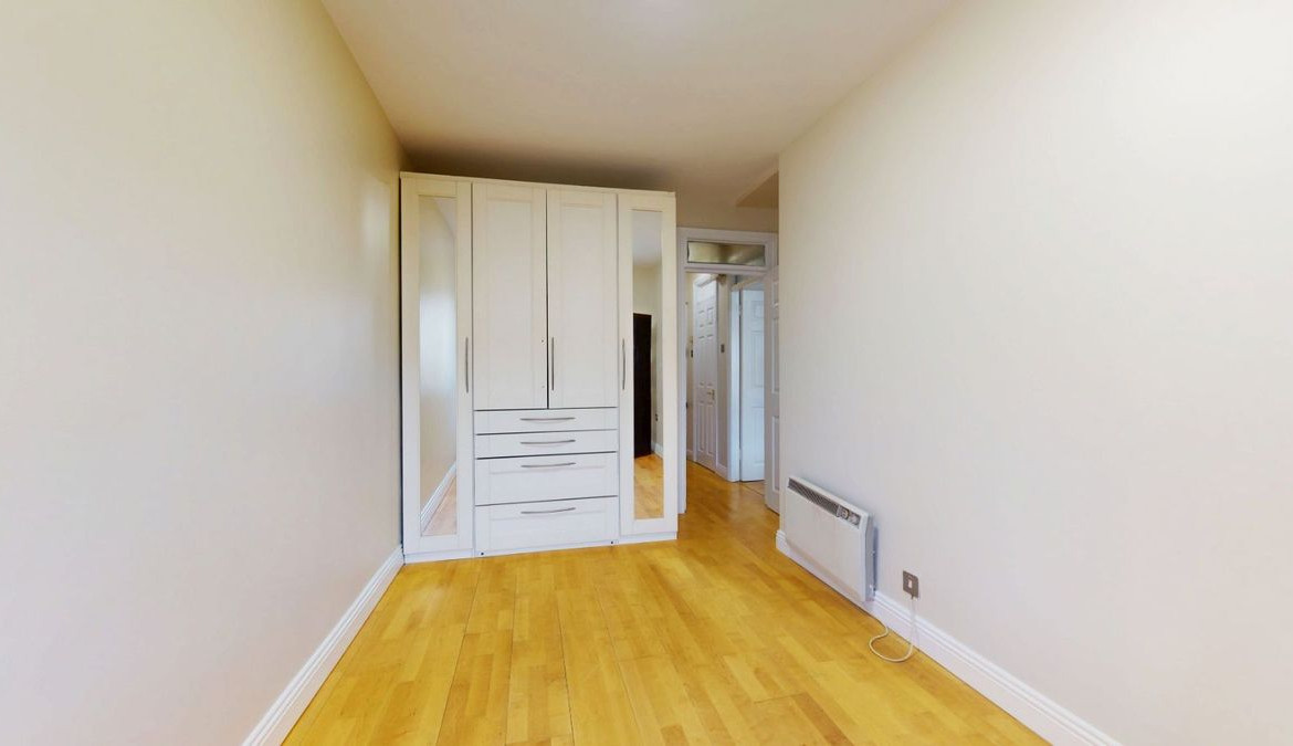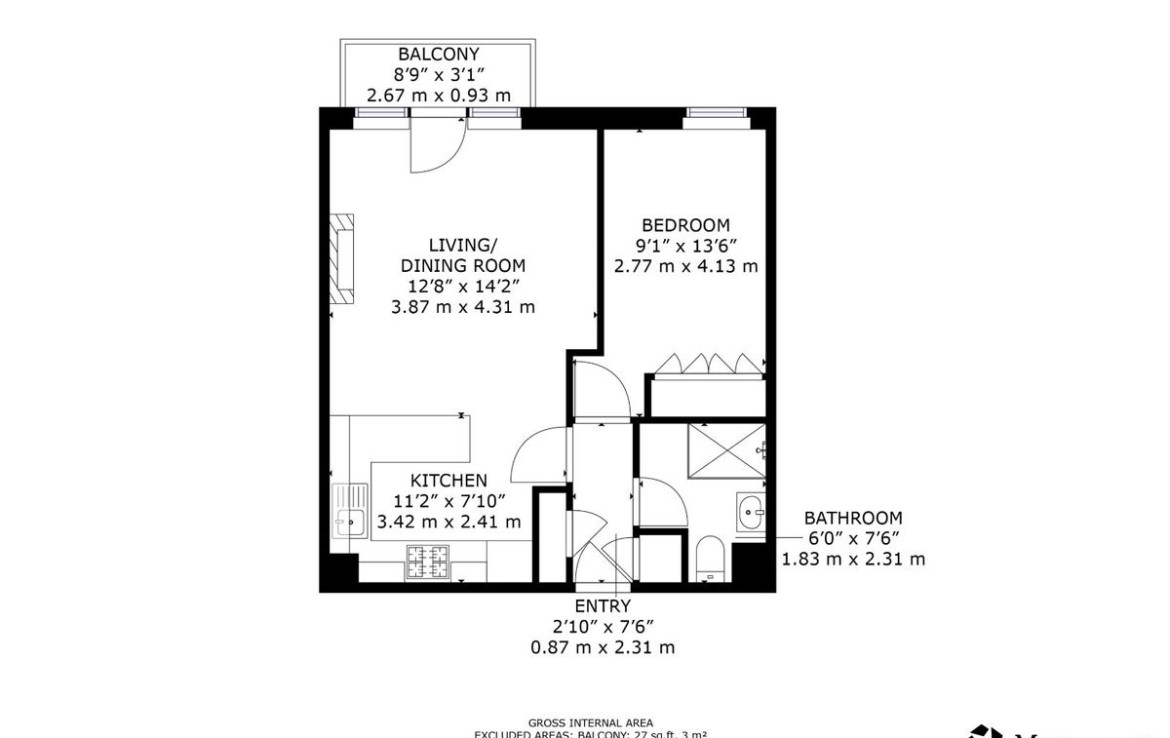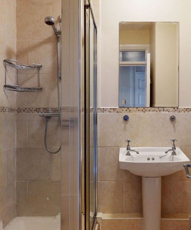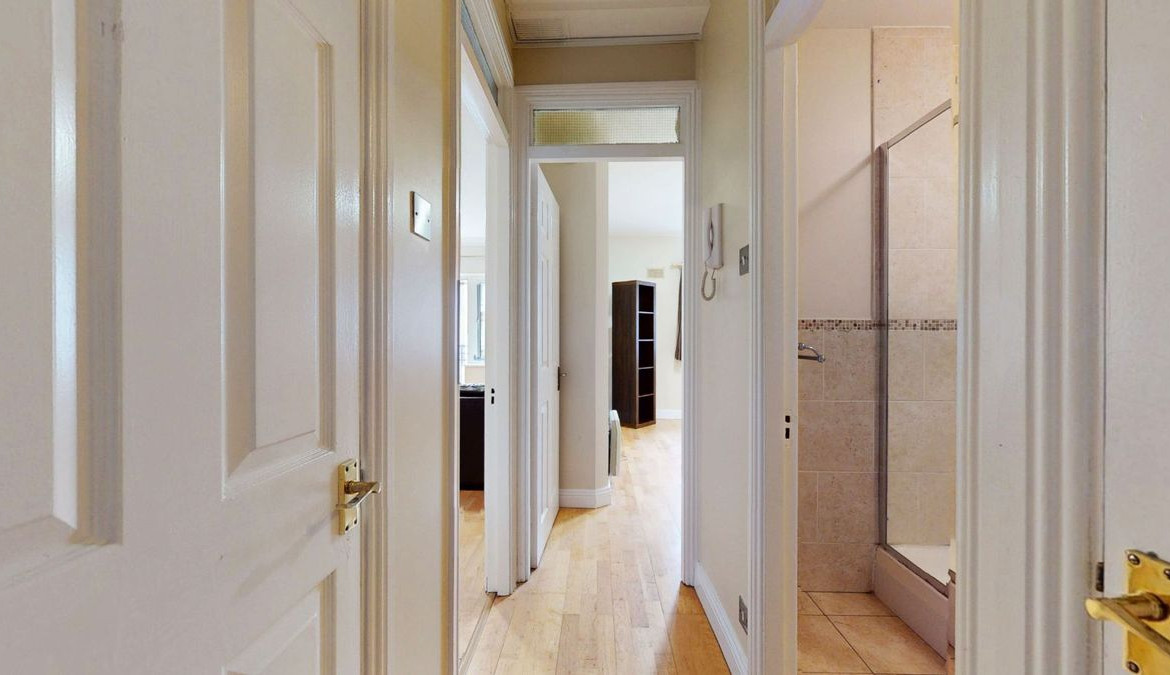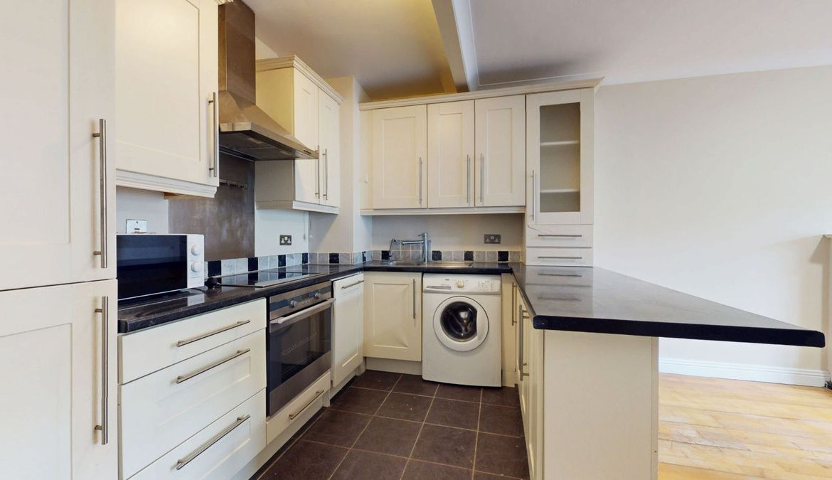 Entrance Hallway: With timber flooring and storage cupboard. Open plan kitchen and living area: 6.46m x 3.88m (max) Previously opened up by removing the wall between the kitchen and the living room creating a bright space availing of the view into the courtyard area. Modern kitchen with eye and floor level units with washing machine, integrated dishwasher, tall fridge freezer, oven and hob. The kitchen area is tiled and the living space has timber flooring and ceiling coving. Timber mantlepiece with electric fire insert. Bedroom: 4.07m x 2.32m Double bedroom with built in wardrobes and timber flooring. Shower room: 1.79m x 1.5m Two piece white suite with shower unit. Tiled floor and half heigh tiling on walls.