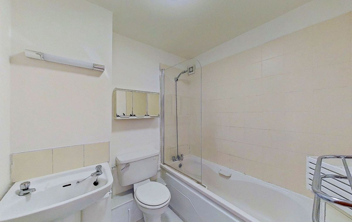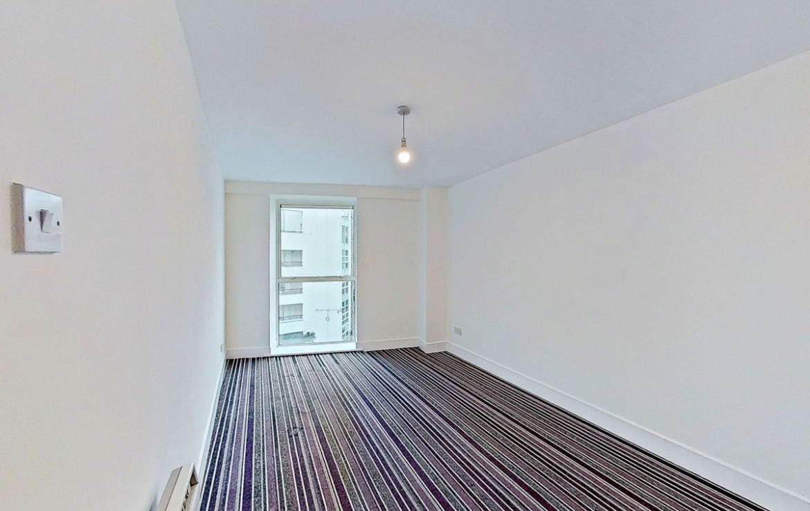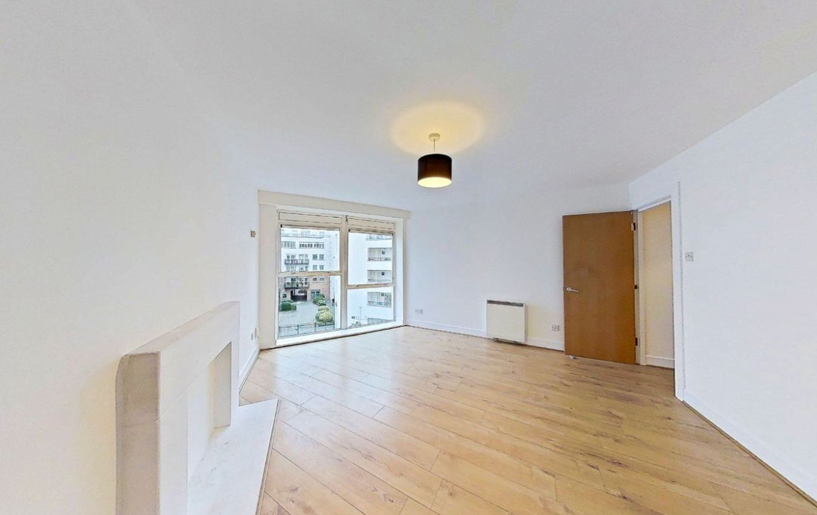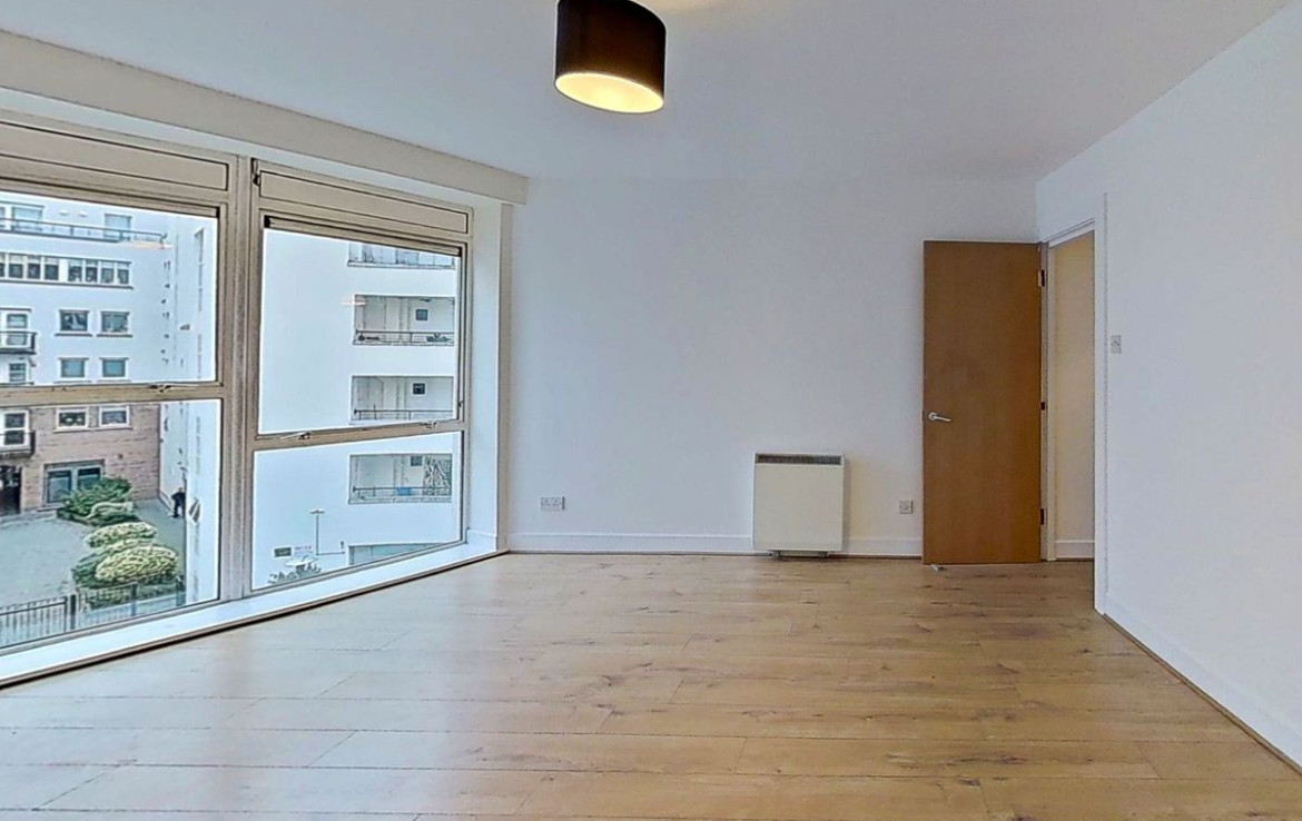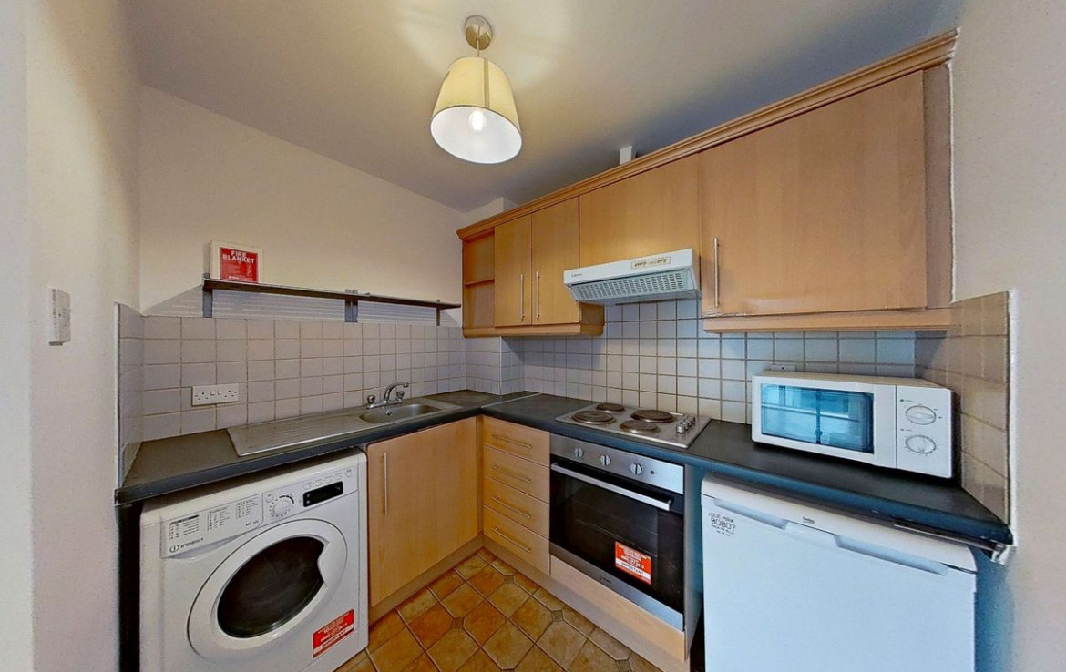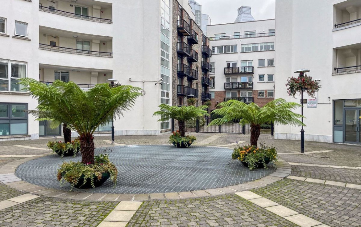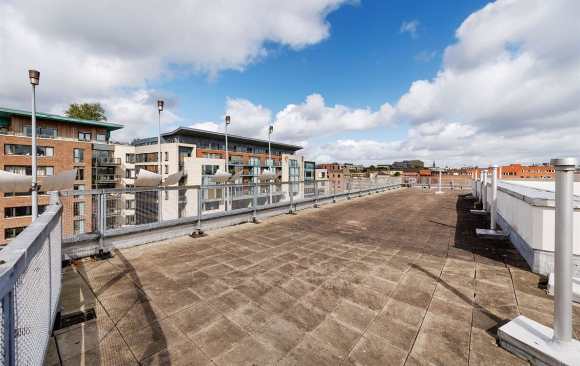 Entrance Hall: Timber flooring. Cloakroom closet – ideal for storage Living Room: 4.9m x 4.12m (max) Bright room overlooking inner courtyard. Timber floor, large picture window and stone fireplace surround. Kitchen: 2.35m x 1.86m Well appointed kitchen with eye and floor level units with space for oven, hob and extractor fan, washing machine and under counter fridge. Tiled floor and splashback. Master Bedroom: 4.04m x 2.66m Spacious double bedroom with built in wardrobes. Bathroom: 2.06m x 1.85m Three piece suite with tiled floor, splashback and around bath. Shaving light. Roof Terrace: Large communal roof terrace with views over Smithfield square and beyond.